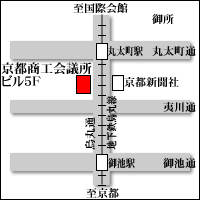 | 〒604-0862 京都市中京区烏丸通夷川上ル少将井町240番地 京都商工会議所ビル5階 TEL:075-211-2256 FAX:075-211-2258 ![]() 地下鉄丸太町駅下車 6番出口より徒歩1分 |