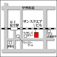 〒183-0023 東京都府中市宮町1-34-2 サンスクエアビル307号室 TEL:042-367-0951 FAX:042-367-0951 ![]() |
